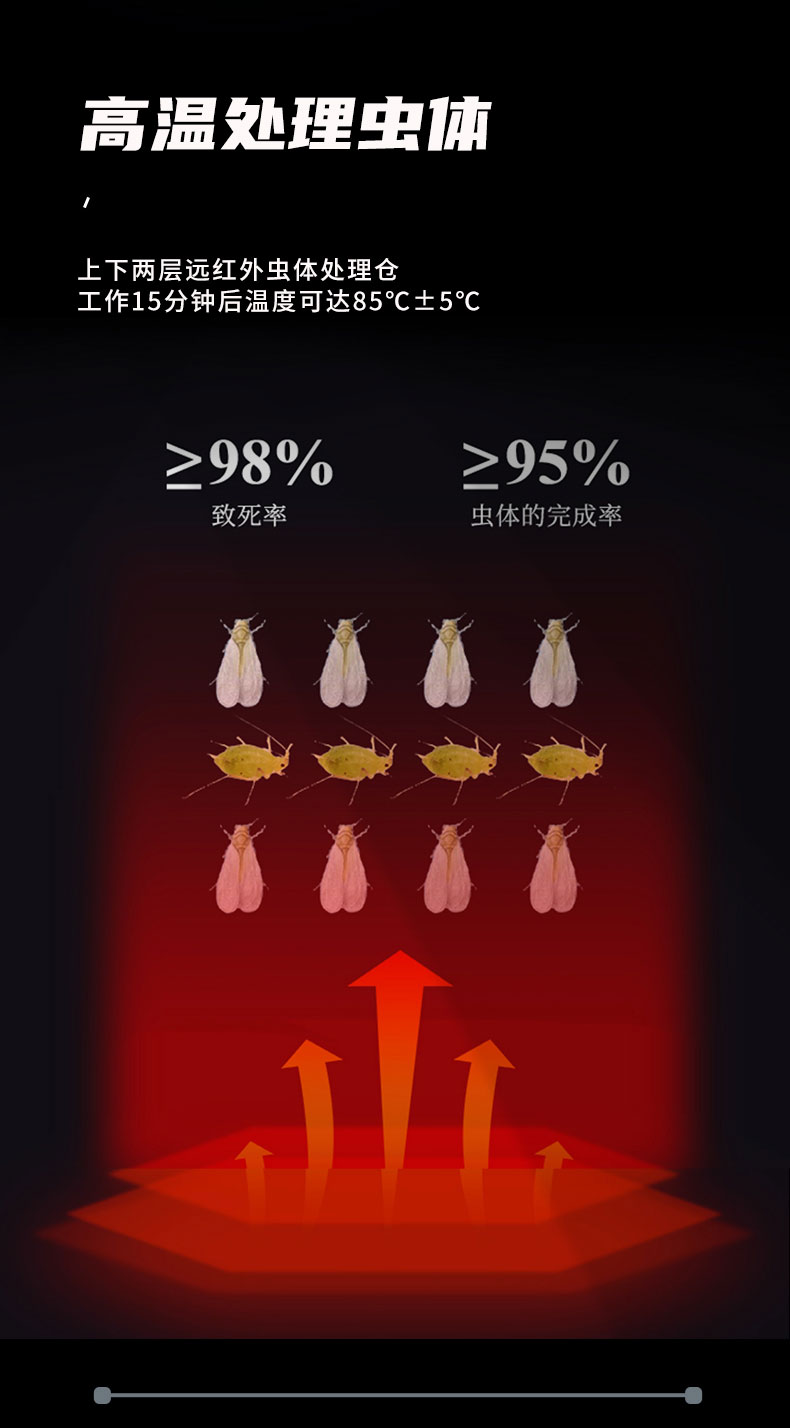 上下两层远红外虫体处理仓,致死率不低于98%,虫体的完成率不小于95%。