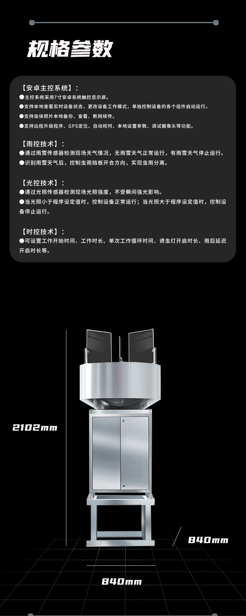 箱体内部含虫雨挡板、杀虫挡板、烘干挡板、震动装置、移虫装置、补光灯、摄像头等机械装置及控制执行设备。