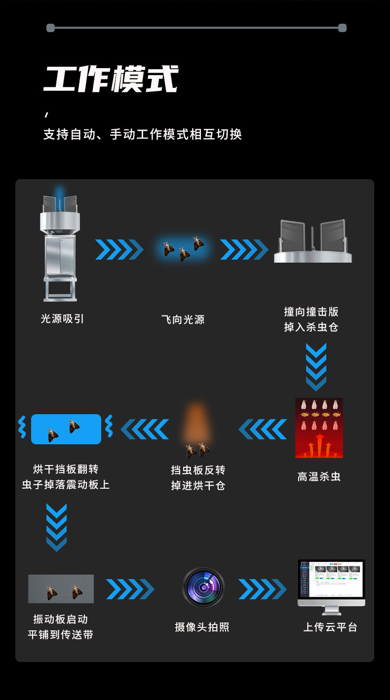 自动工作模式工作流程:高空迁飞性害虫受探照灯光源吸引→延光路飞向光源→撞向撞击版 →撞击后掉入杀虫仓→杀虫仓高温杀死虫子后→杀虫挡板翻转→虫子尸体掉进烘干仓→烘干仓进行高温烘干,烘干完成后→烘干挡板翻转→虫子尸体掉落在震动板上→震动板启动→虫子尸平铺至传送带上→传送带将将飞虫尸体运送到摄像头下→拍照→上传照片至服务器。