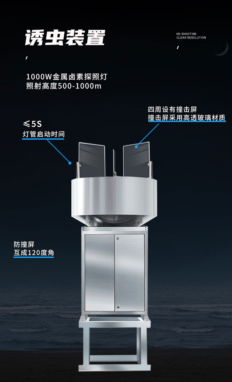 高空测报灯由诱虫装置、撞击板、杀虫装置、高清摄像头、安卓主控系统、机械组件、雨雪传感器、光感传感器、专业金属箱体框架、安装底座等组成。