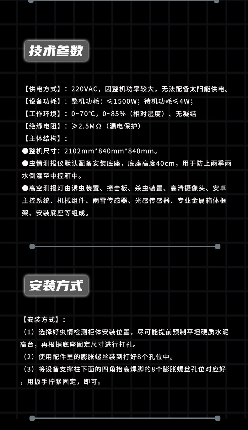 (1)选择好虫情检测柜体安装位置,尽可能提前预制平坦硬质水泥高台,再根据底座固定尺寸进行打孔。