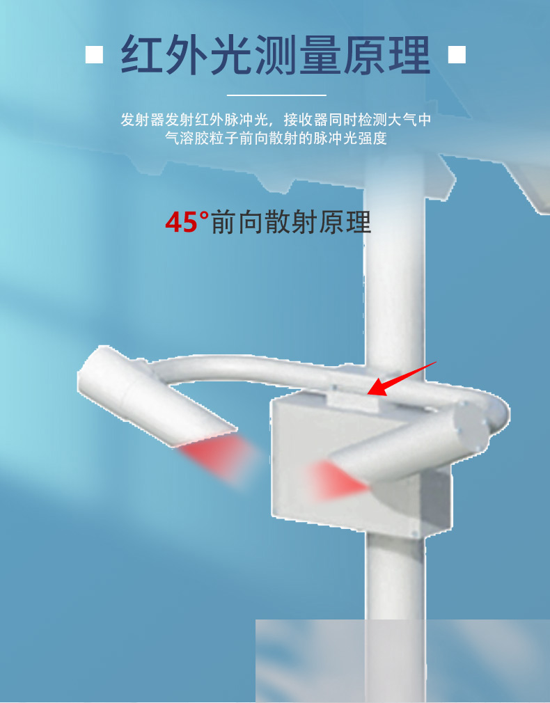 1.能见度仪:由光发射器、光接收器及微处理控制器等主要部件组成。发射器发射红外脉冲光,接收器同时检测大气中气溶胶粒子前向散射的脉冲光强度,所有测量信息由微处理控制器搜集并通过专门的数学模型算法转化为气象光学视程Meteorological Optical Range(MOR)
