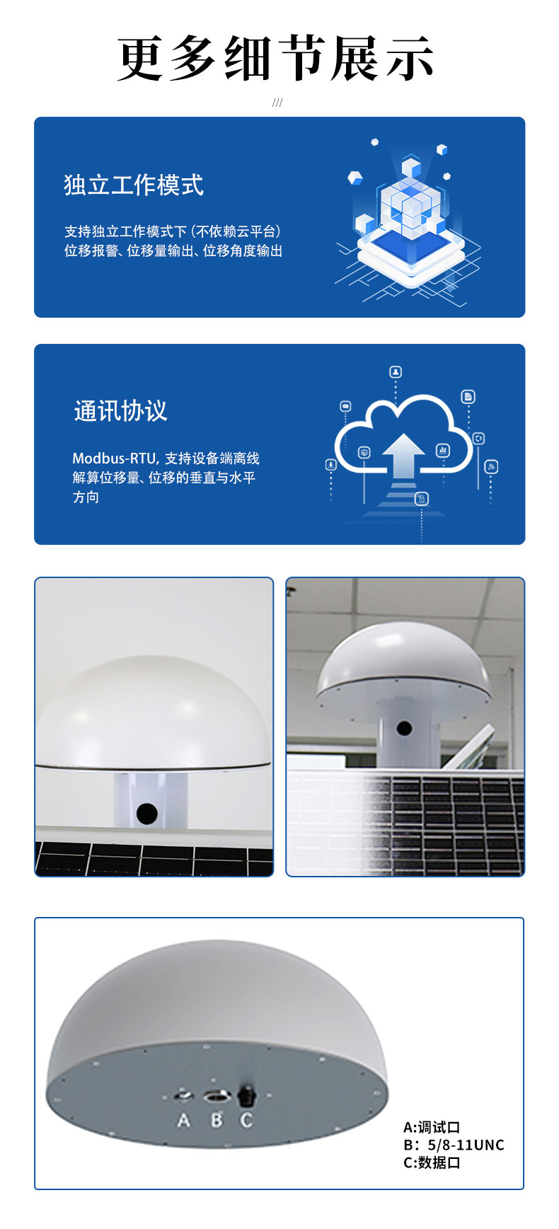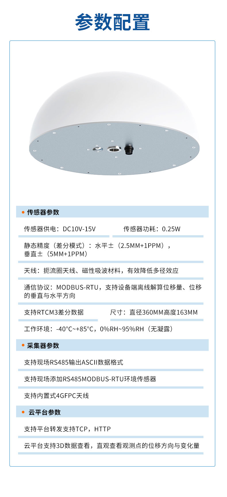 【产品简介】一、GNSS传感器产品简介GNSS传感器是采用差分RTK技术实现的毫米级位移监测产品,可广泛应用于大坝安全监测、桥梁健康检测、滑坡预警等工程领域。该产品具备高精度、高稳定性及实时数···
