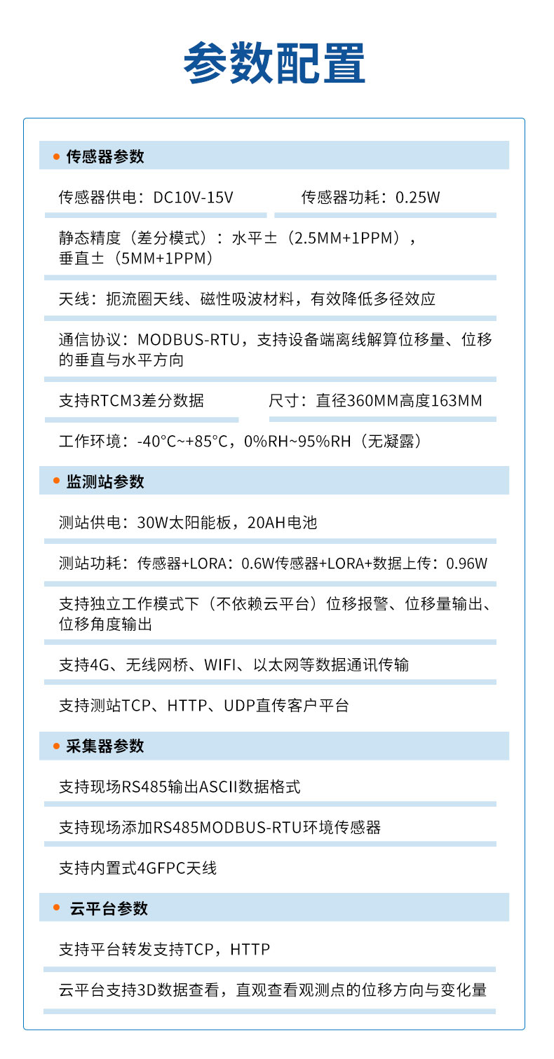 【产品简介】一、GNSS监测系统产品简介GNSS监测系统是采用差分RTK技术实现的毫米级位移监测产品,可广泛应用于大坝安全监测、桥梁健康检测、滑坡预警等工程领域。该产品具备高精度、高稳定性及实···