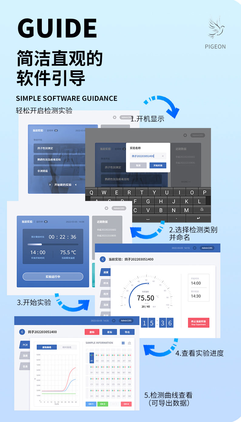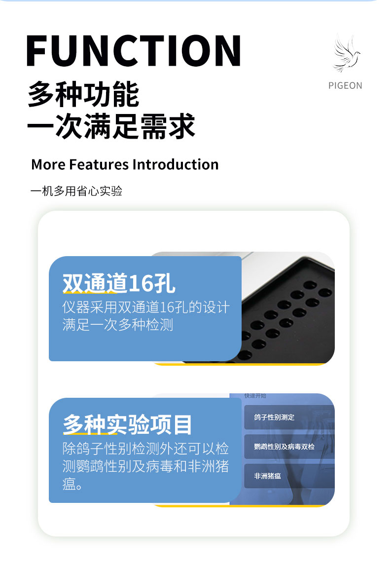 【产品简介】鸽子性别鉴别仪是实时检测反应的仪器,主要由基因扩增热循环组件、微量荧光检测光学系统、微电路控制系统、计算机及应用软件组成。操作简单,可无创鉴别鸽子性别,准确率达到99.9%。二、鸽···