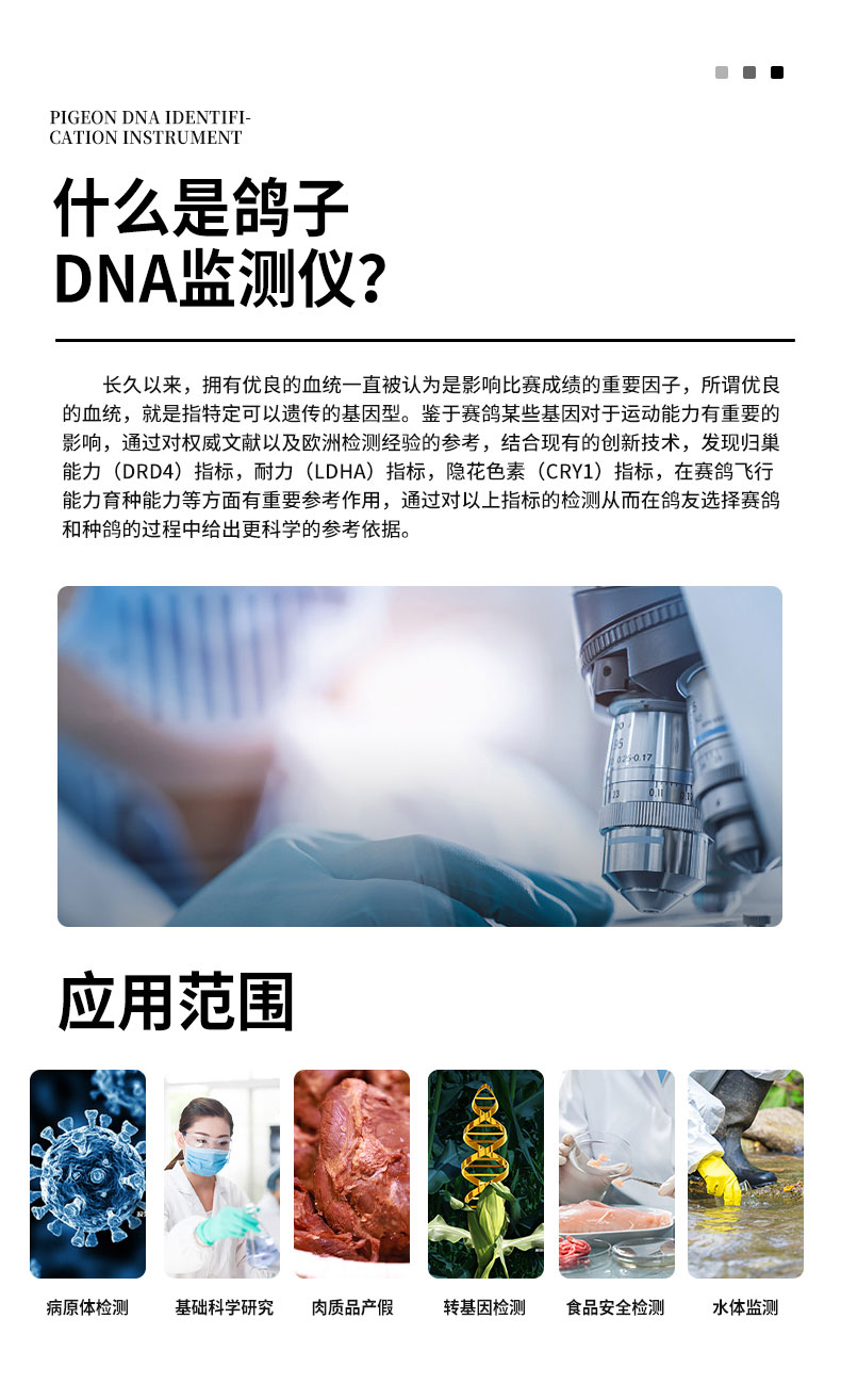 【产品简介】长久以来,拥有优良的血统一直被认为是影响比赛成绩的重要因子,所谓优良的血统,就是指特定可以遗传的基因型。鉴于赛鸽某些基因对于运动能力有重要的影响,通过对权威文献以及欧洲检测经验的参···