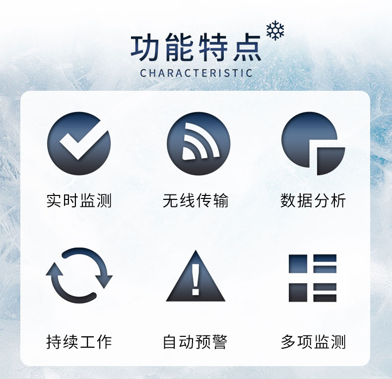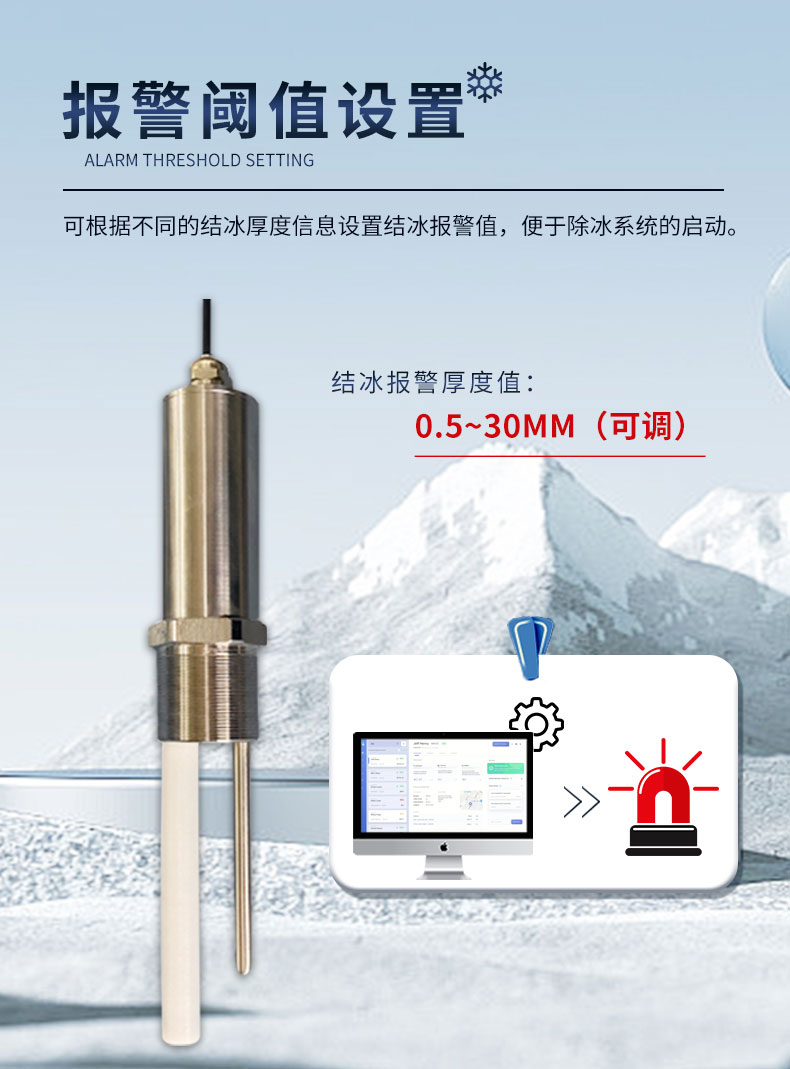 结冰传感器采用独特的微波检测技术并结合温度分析实现对各种类的风力发电机组的机箱、叶片、电缆、冷却塔、通信天线、户外设备等进行结冰情况的实时监控,给出监测区域的结冰报警,并可进行结冰厚度的计算,实时评估结冰的危害,并给出除冰控制指令,启动除冰系统,保护结冰恶劣气候环境下设备机组的安全运行,提高设备运行效率,减少除冰耗能。