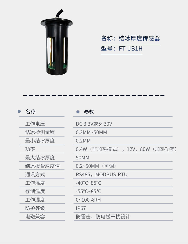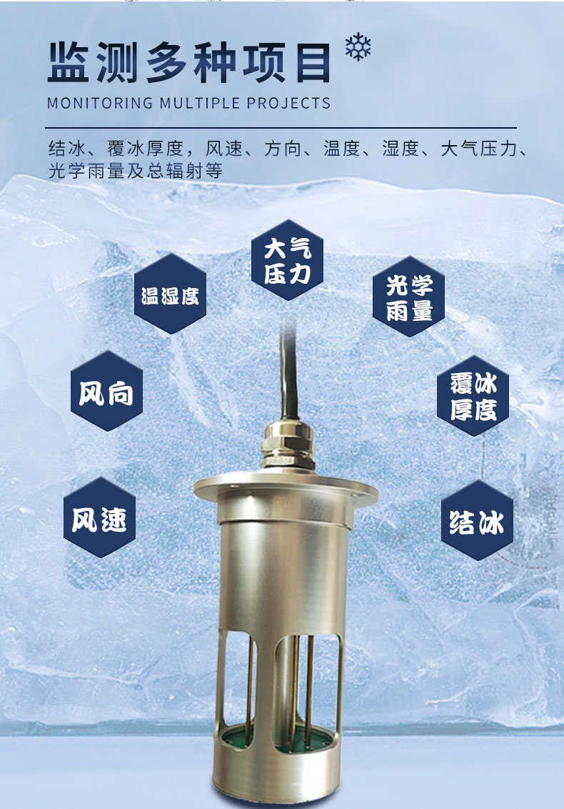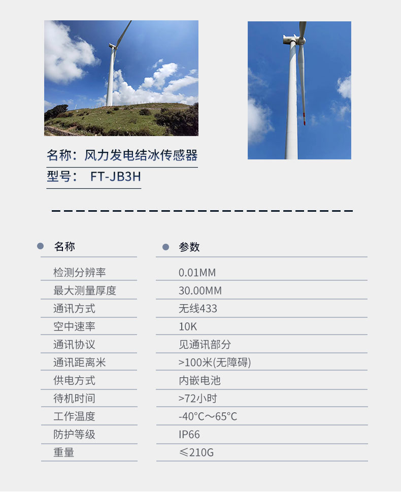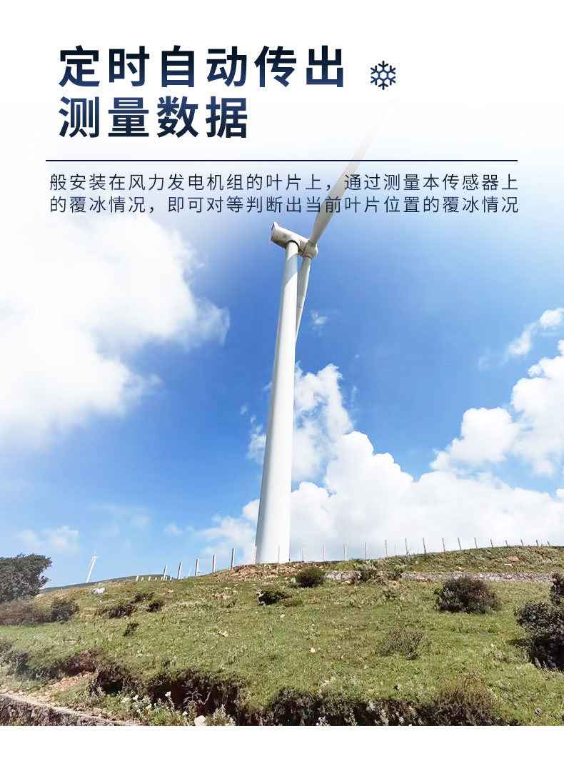 【产品简介】一、结冰传感器简介结冰传感器采用独特的微波检测技术并结合温度分析实现对各种类的风力发电机组的机箱、叶片、电缆、冷却塔、通信天线、户外设备等进行结冰情况的实时监控,给出监测区域的结冰···