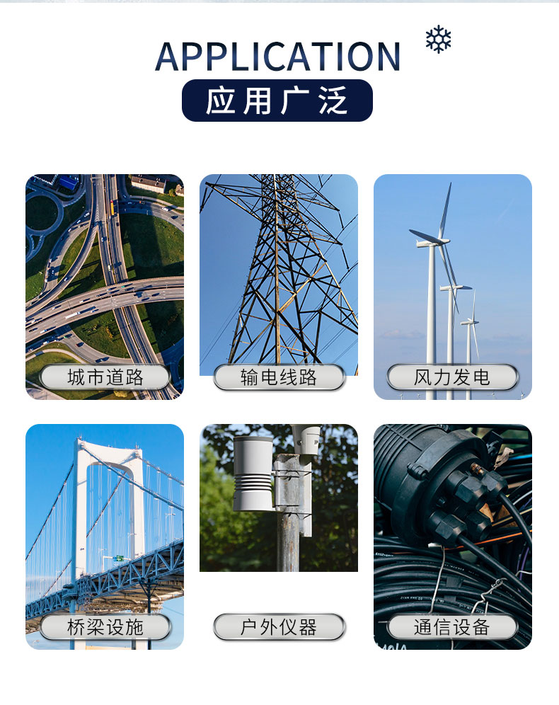 户外设备、天线、冷却塔、电缆等设备的结冰监测,根据实际应用场合选择安装位置,传感器可根据实际位置定制化设计,便于最大程度的反应设备的结冰信息。