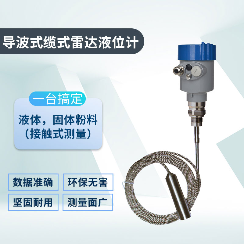 【产品简介】一、导播缆式雷达液位计产品原理导波雷达发出的高频微波脉冲沿着探测组件(钢缆或钢棒)传播,遇到被测介质,由于介电常数突变,引起反射,一部分脉冲能量被反射回来。发射脉冲与反射脉冲的时间···