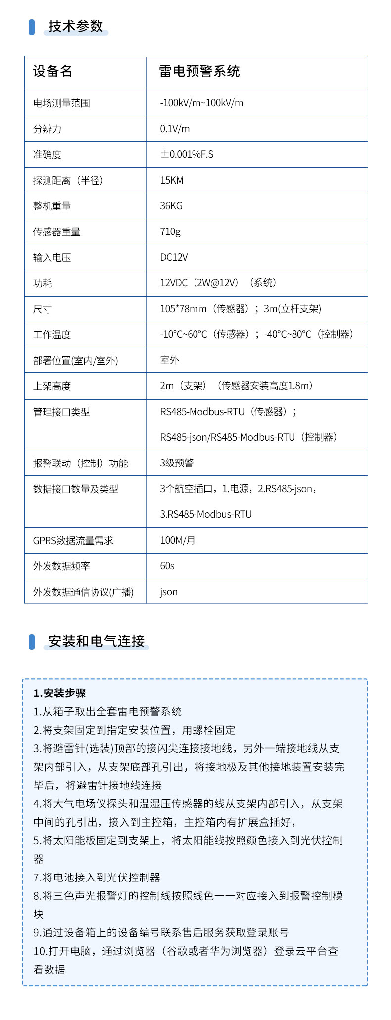 2.雷电预警探头应安装于无遮挡以及周边无遮挡物的户外