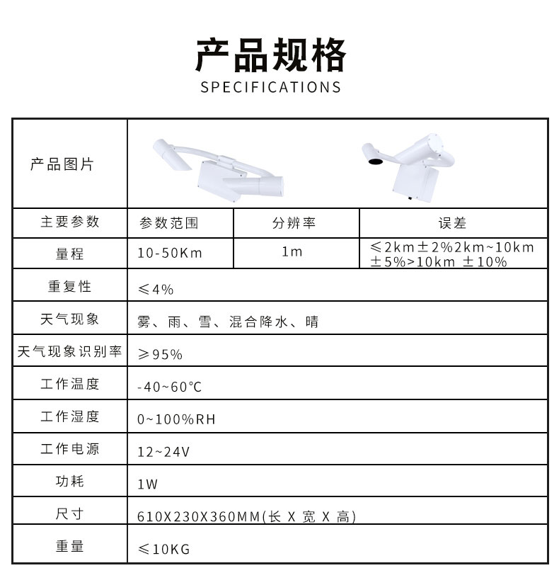 【产品简介】一、80KM能见度传感器产品简介N80型80KM能见度传感器采用前向散射法测量空气总消光系数,进而计算当前能见度,广泛用于道路交通、气象等行业。二、80KM能见度传感器技术特点1.···