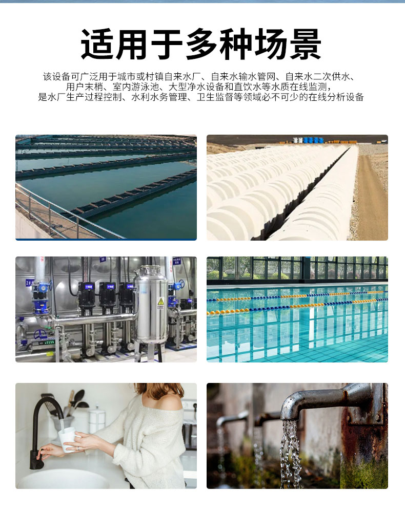 水质六参数监测仪可广泛用于河流、城市或村镇自来水厂、自来水输水管网、自来水二次供水、用户末梢、室内游泳池、大型净水设备和直饮水等水质在线监测,是水厂生产过程控制、水利水务管理、卫生监督等领域必不可少的在线分析设备。