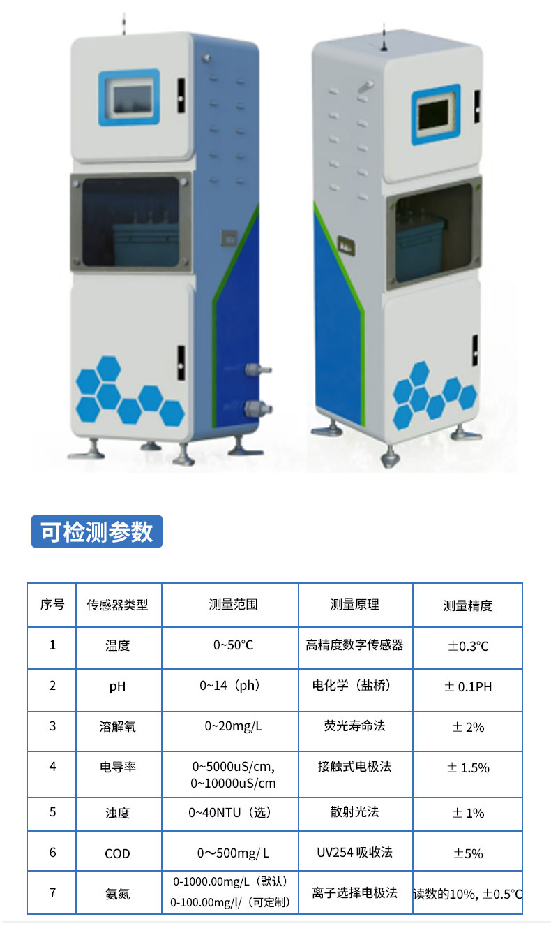 | 5 | 氨氮 | 0-1000.00mg/L(默认) 0-100.00mg/l/(可定制) | 离子选择电极法 | 读数的10%, ±0.5℃ | √ |