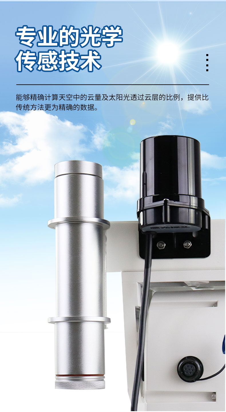 云量分析仪利用先进的机器学习技术和尖端的大模型算法,结合专业的光学传感技术,能够精确计算天空中的云量及太阳光透过云层的比例,提供比传统方法更为精确的数据。
