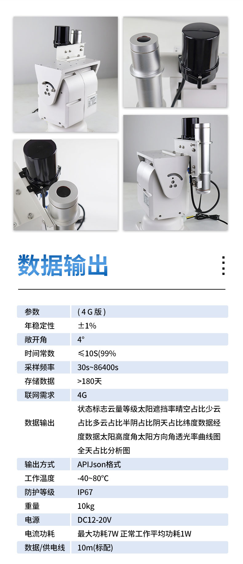 | 数据输出 | 状态标志 云量等级 太阳遮挡率晴空占比 少云占比 多云占比 半阴占比 阴天占比 纬度数据 经度数据 太阳高度角 太阳方向角 透光率曲线图 全天占比分析图 |