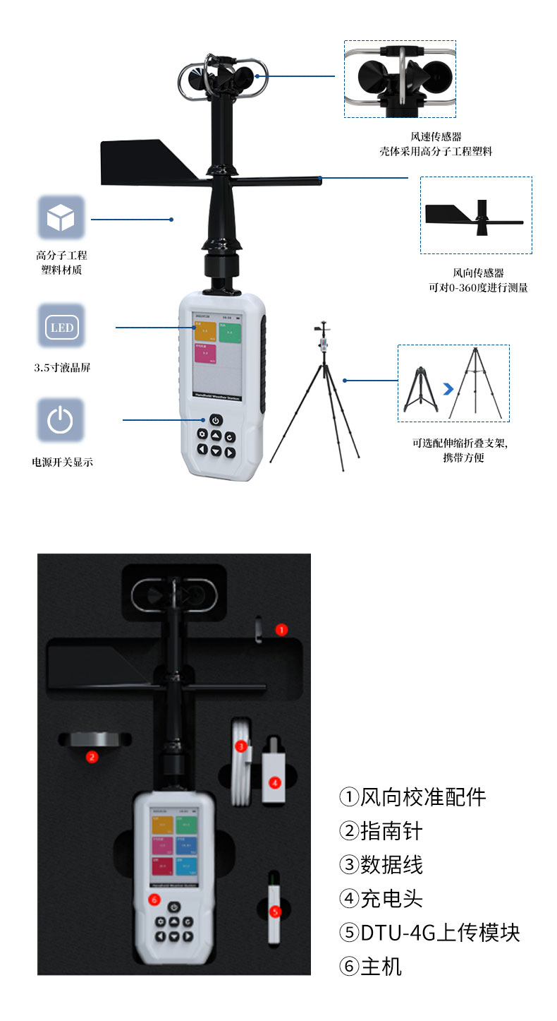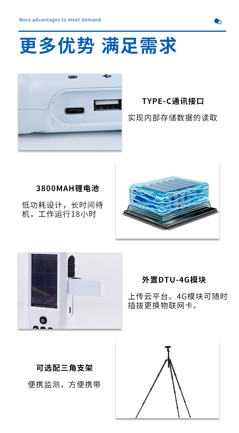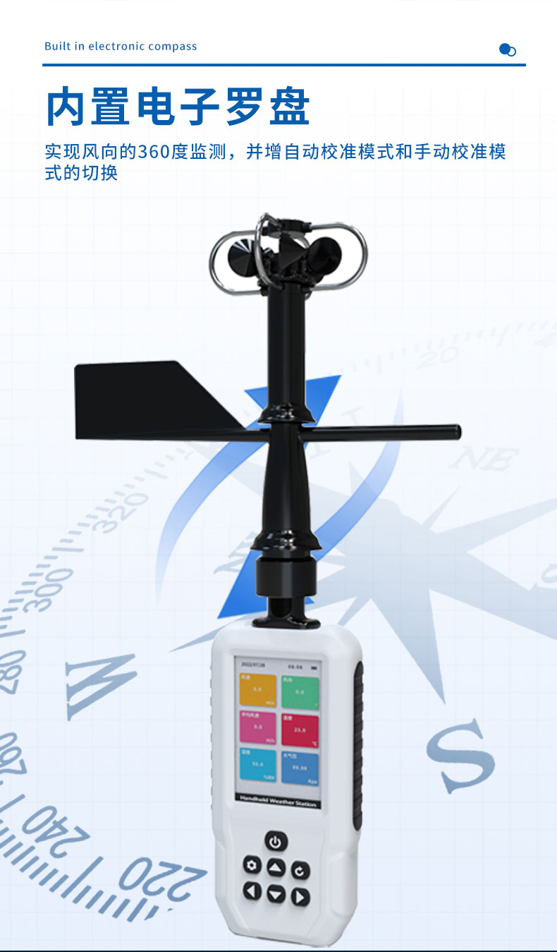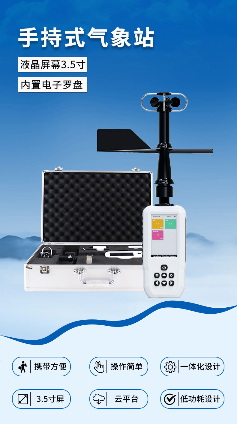 【产品简介】一、手持气象站产品简介是一款携带方便,操作简单,集多项气象要素于一体的可移动式气象观测仪器。系统采用精密传感器及智能芯片,能同时对风速、风向、平均风速、温度、湿度、大气压、海拔、热···