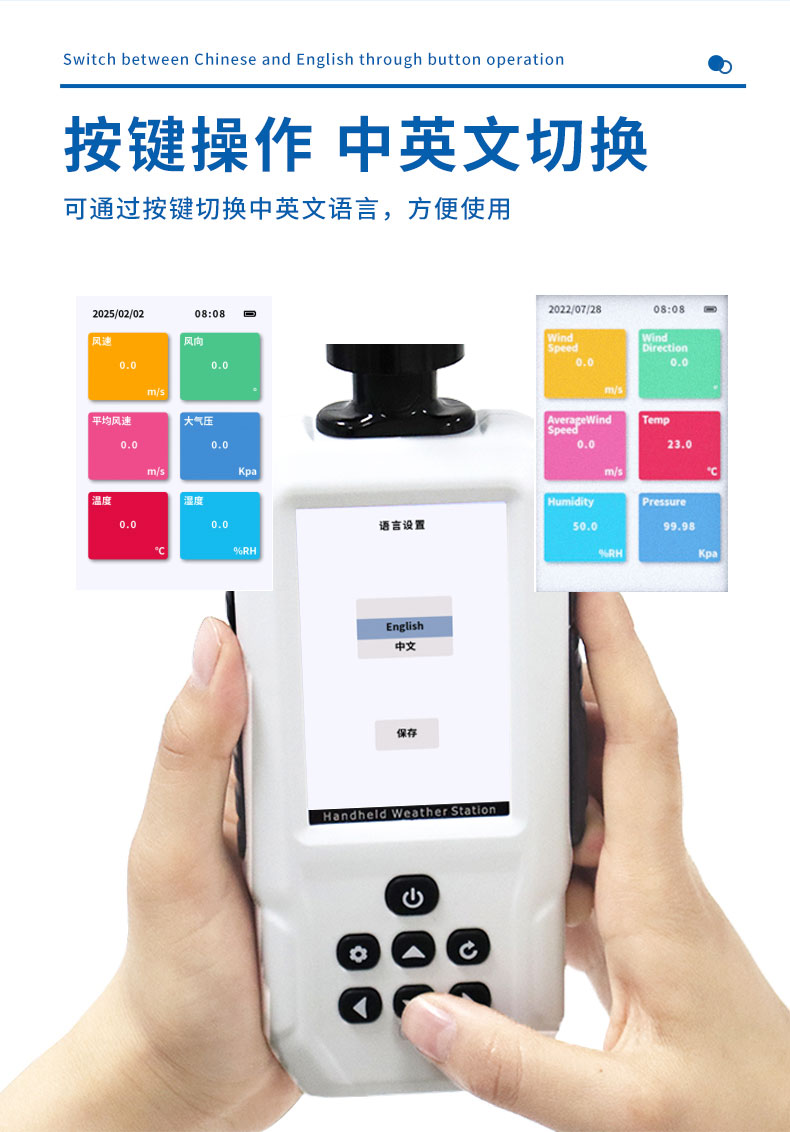 是一款携带方便,操作简单,集多项气象要素于一体的可移动式气象观测仪器。系统采用精密传感器及智能芯片,能同时对风速、风向、平均风速、温度、湿度、大气压、海拔、热力指数、湿球温度、浪高、露点温度、风寒指数、GNSS三模定位等要素进行准确测量。内置大容量FLASH存储芯片可存储至少一年的气象数据;Type-C通讯接口,方便用户对气象数据的进一步处理分析。