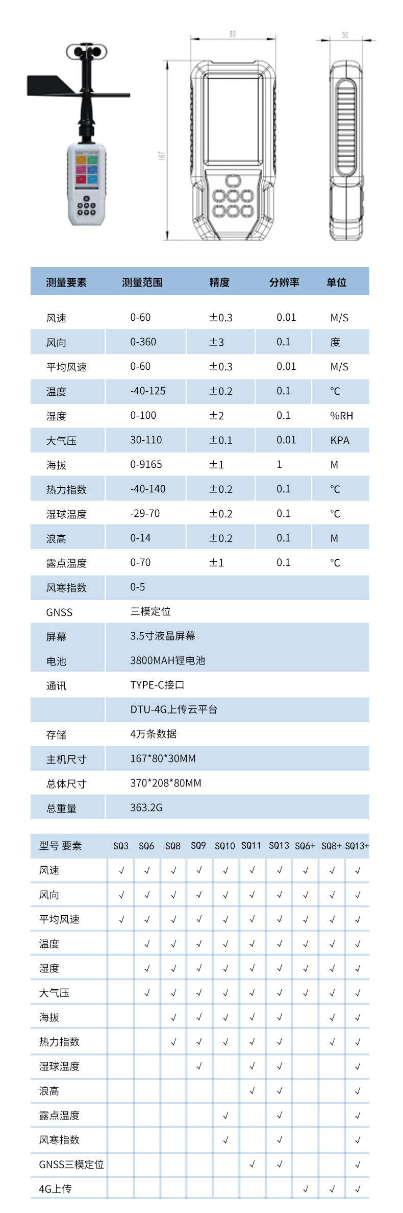 1.液晶屏幕3.5寸,可显示风速、风向、平均风速、温度、湿度、大气压、海拔、热力指数、湿球温度、浪高、露点温度、风寒指数、GNSS三模定位等要素。☆