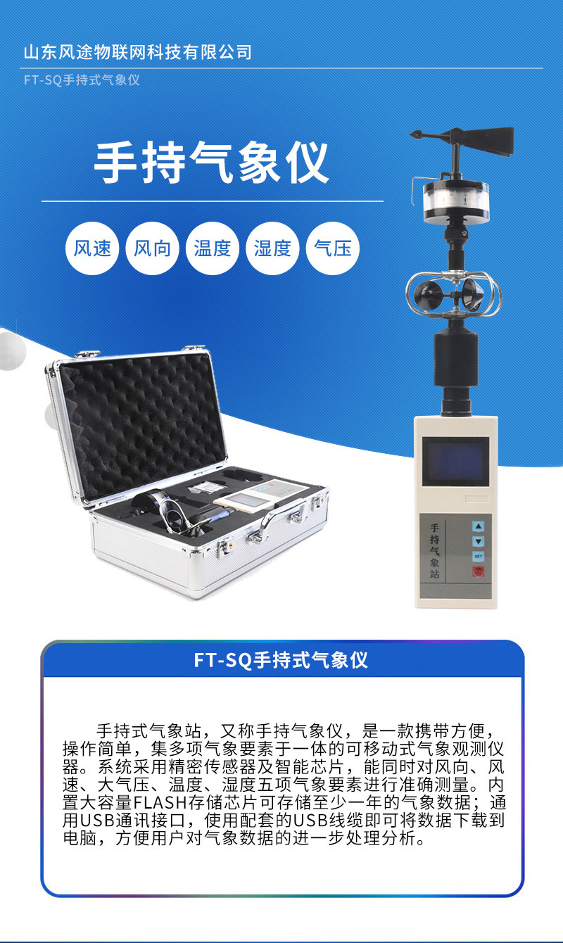 手持式风速风向仪是一款携带方便,操作简单,集多项气象要素于一体的可移动式气象观测仪器。系统采用精密传感器及智能芯片,能同时对风向、风速两项气象要素进行准确测量。内置大容量FLASH存储芯片可存储至少一年的气象数据;通用USB通讯接口,接入U盘导出数据,方便用户对气象数据的进一步处理分析。