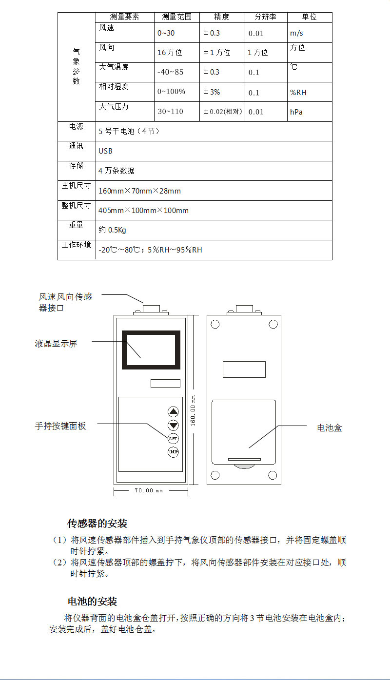 | 气象参数 | 测量要素 | 测量范围 | 精度 | 分辨率 | 单位 |