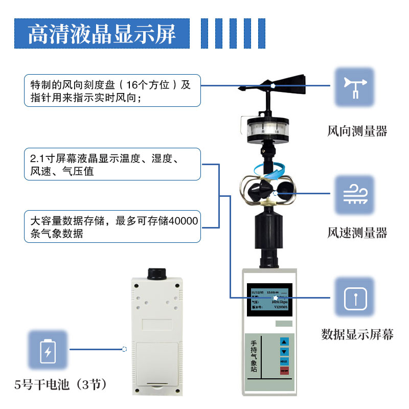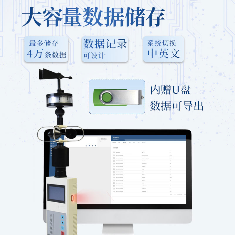 电子气象仪是一款携带方便,操作简单,集多项气象要素于一体的可移动式气象观测仪器。系统采用精密传感器及智能芯片,能同时对风向、风速、大气压、温度、湿度五项气象要素进行准确测量。内置大容量FLASH存储芯片可存储至少一年的气象数据;通用USB通讯接口,接入U盘导出数据,方便用户对气象数据的进一步处理分析。