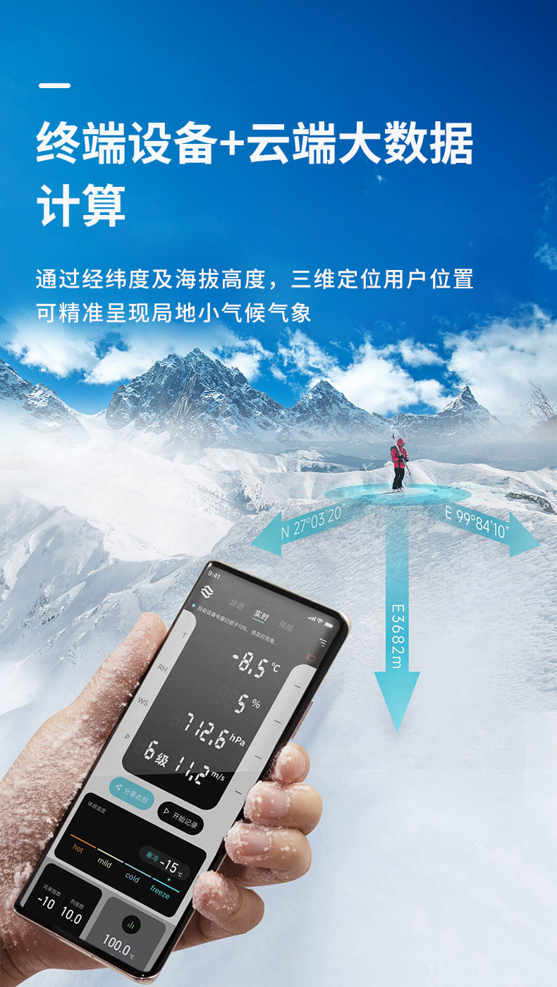 通过经纬度及海拔高度,三维定位用户位置,智能算法综合处理了硬件端实采气象数据和后台云公共网络数据,以实现局地小气候的定制化预报,帮助用户精准把控营地天气。