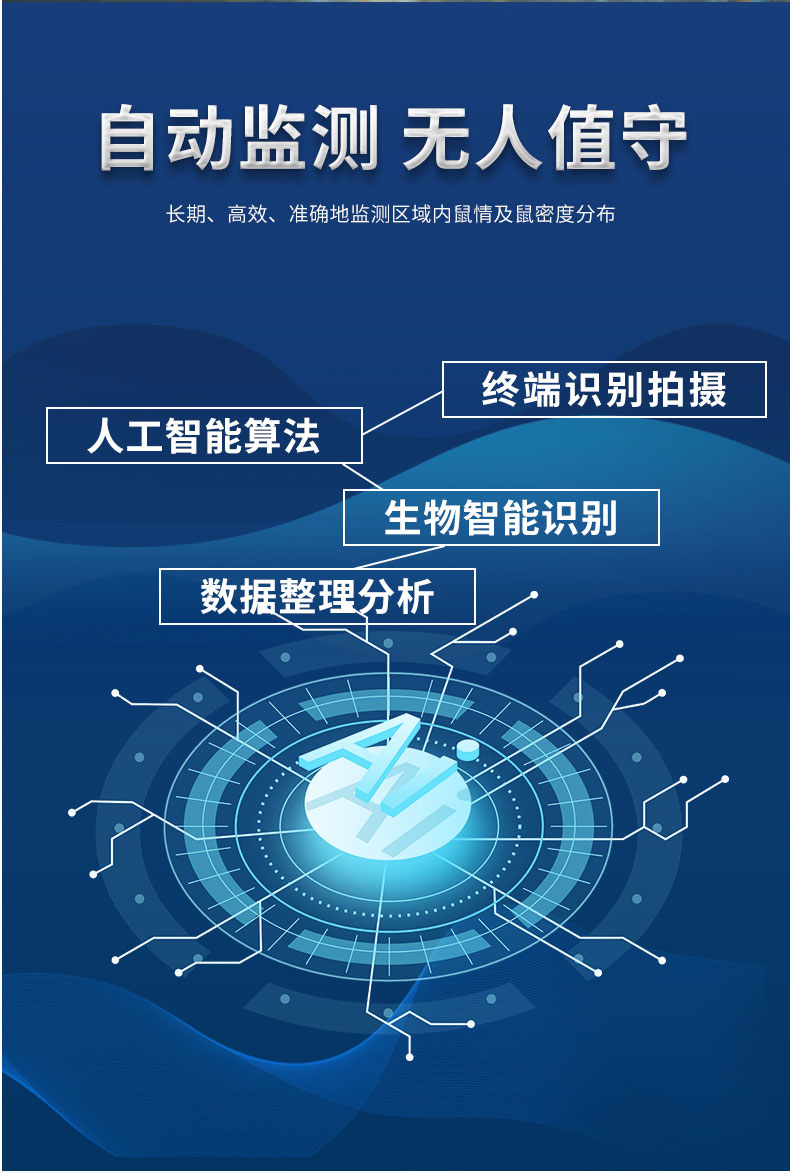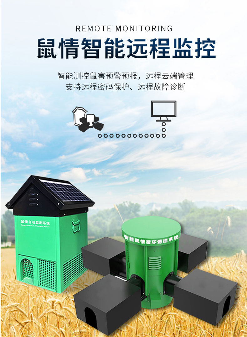 鼠害监测仪采用先进的结构设计理念,内部设计有单向通道,老鼠进入设备后无法逃逸。设备内置高清摄像头,老鼠触发入口监测装置后自动拍照并上传至服务器,服务器带有自动识别软件,能够自动识别鼠害的数量及种类,方便用户统计数据及活动规律。