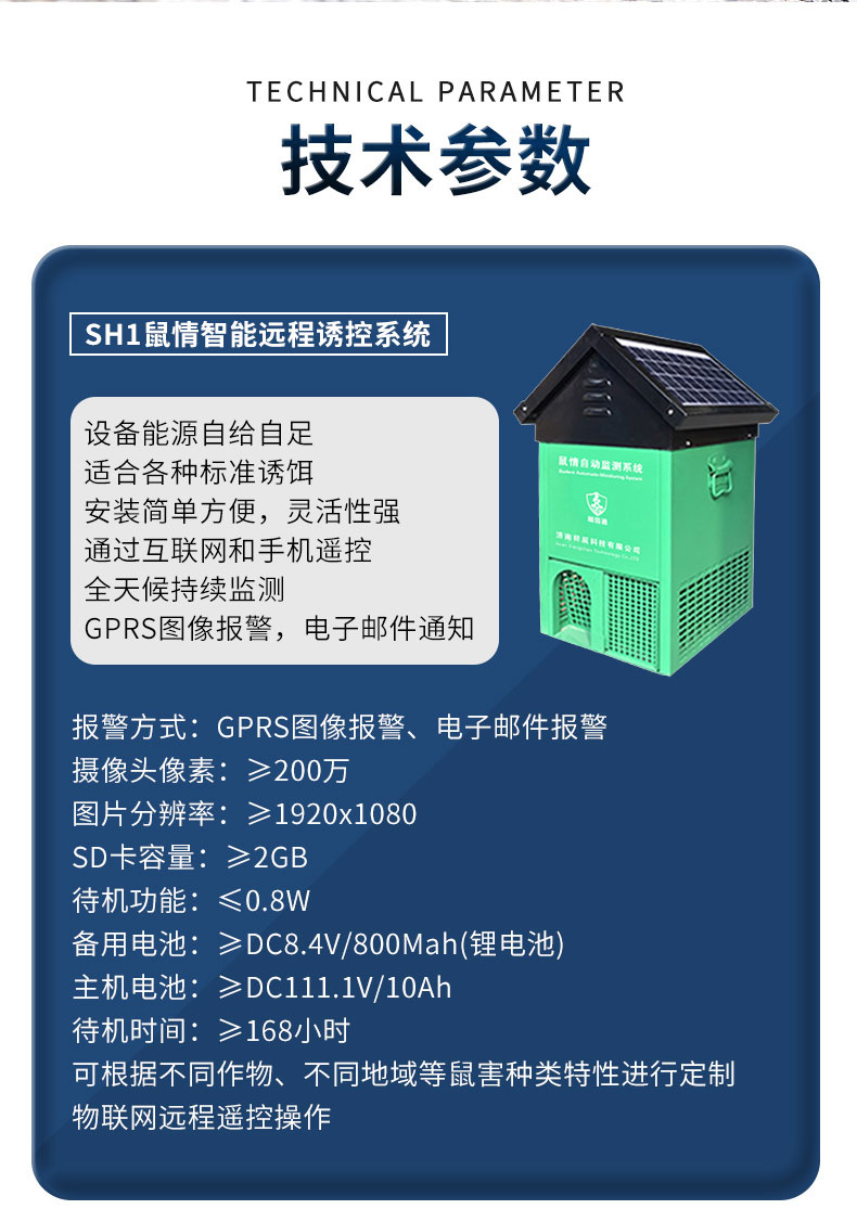 【产品简介】一、鼠害监测仪产品简介鼠害监测仪采用先进的结构设计理念,内部设计有单向通道,老鼠进入设备后无法逃逸。设备内置高清摄像头,老鼠触发入口监测装置后自动拍照并上传至服务器,服务器带有自动···