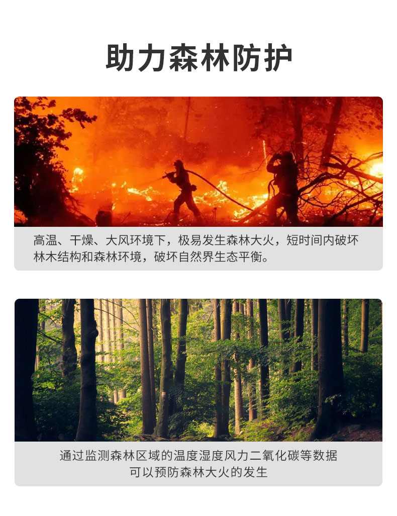 森林火灾是森林生态系统的大敌,它能在很短时间内,烧毁大面积的森林和大量的林副产品,破坏林分结构和森林环境,破坏自然界生态平衡,造成气候失调,水土流失,河流淤塞,洪水泛滥或水源枯竭。通过监测容易发生森林火灾区域的风速风向、空气的温度、相对湿度、太阳辐射等气象因子,可以对预防森林大火的发生,在发生大火时也可以指导工作人员进行快速合理的灭火工作,使财产损失降到低点。