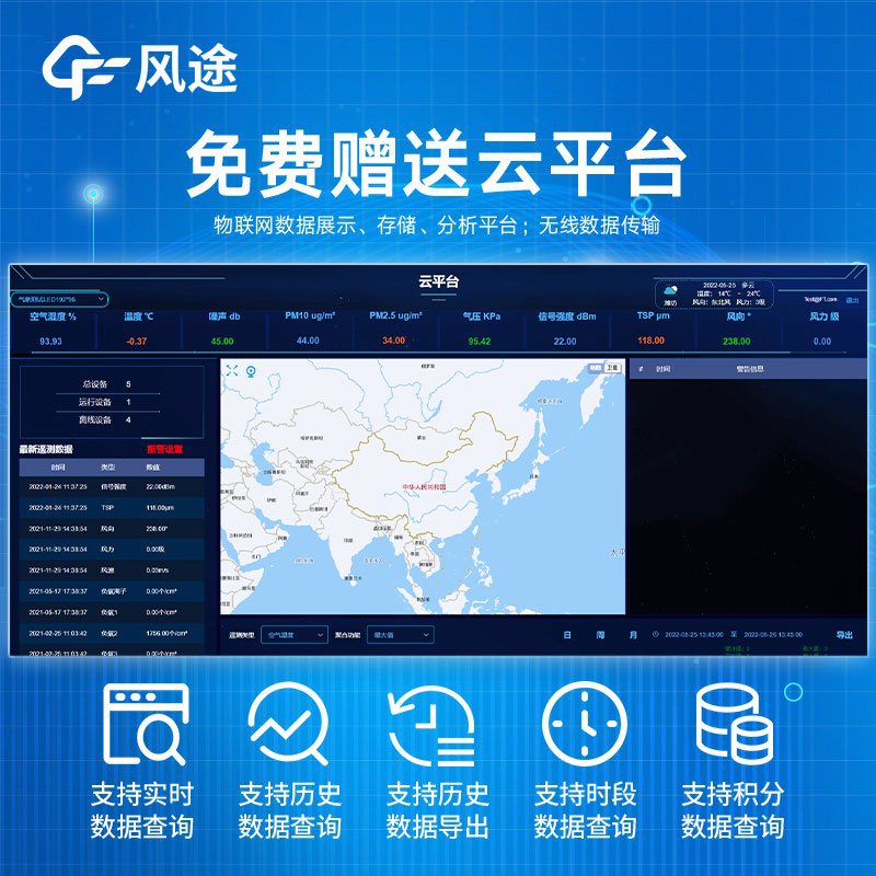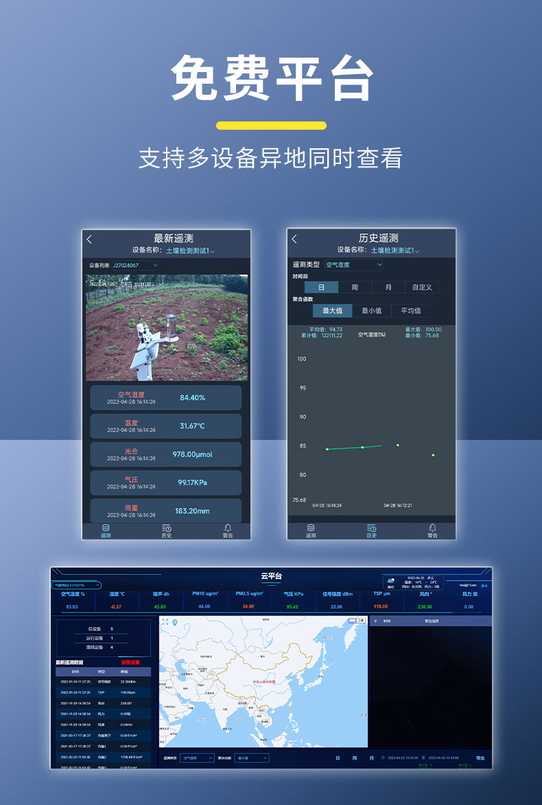 该设备由气象传感器,采集器,太阳能供电系统,立杆支架,云平台五部分组成。免调试,可快速布置,广泛运用于气象、农业、林业、环保、海洋、机场、港口、科学考察、校园教育等领域。