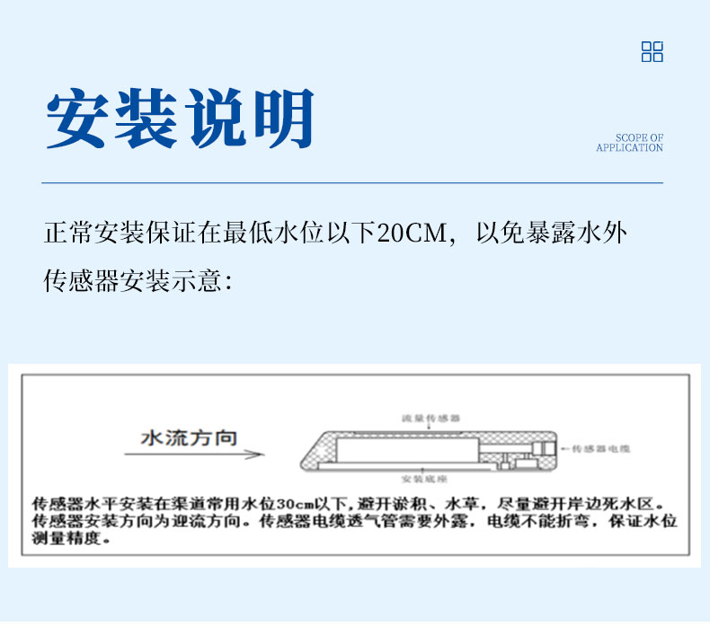1.传感器需要避开淤泥,避开石子等物体撞击,水草多的地方需要加装格栅避免水草缠绕。