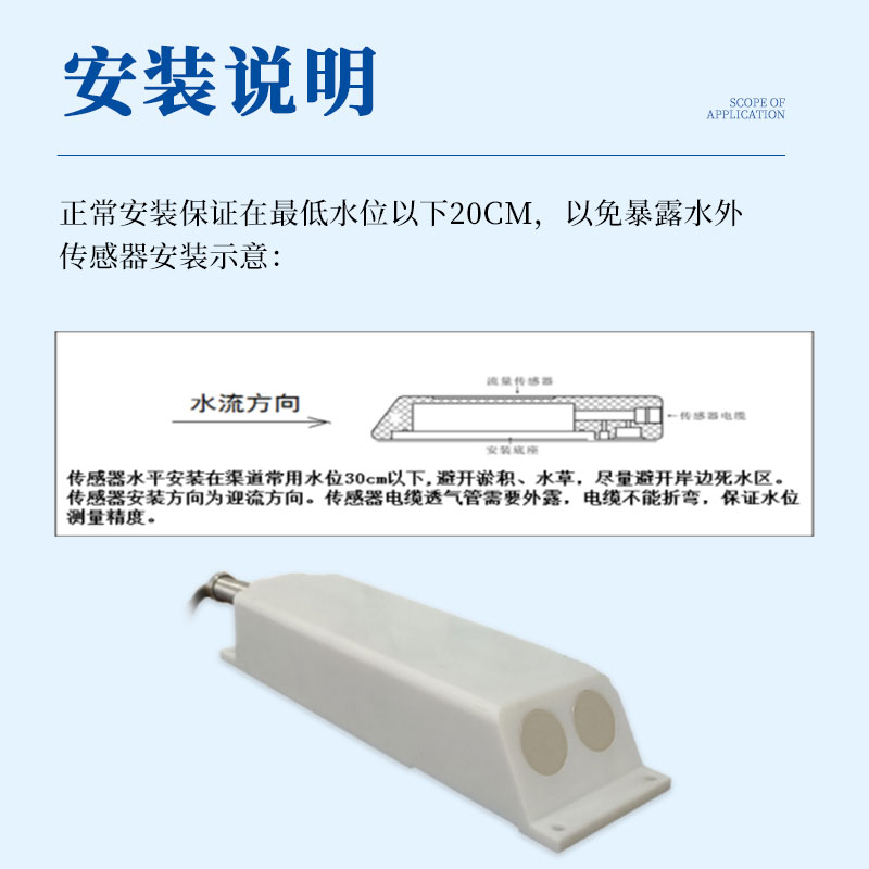 3.传感器有声波盲区,尽量保证传感器在水下20厘米以下( 传感器半暴露水下、或者被污泥遮挡可能会出现虚假数据,概率非常低,通常数据会出现大数比如2米/秒以上,建议使用传感器二次开发人员可以通过水位高低屏蔽大流速值,或者实际应用场合水流速没有那么大可以直接屏蔽大于2米以上流速)。
