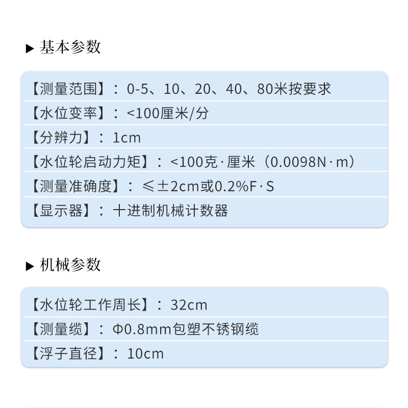 本系列仪器中机械式水位传感器的水位轮测量圆周长为32厘米,且水位轮与传感器为同轴联接,水位轮每转一圈,传感器也转一圈,输出对应的32组数字编码。当水位上升或下降,传感器的轴就旋转一定的角度,传感器同步输出一组对应的数字编码(二进制循环码,又称格雷码)。不同量程的仪器能够输出1024至8192组不同的编码,可以用于测量10至80米水位变幅。