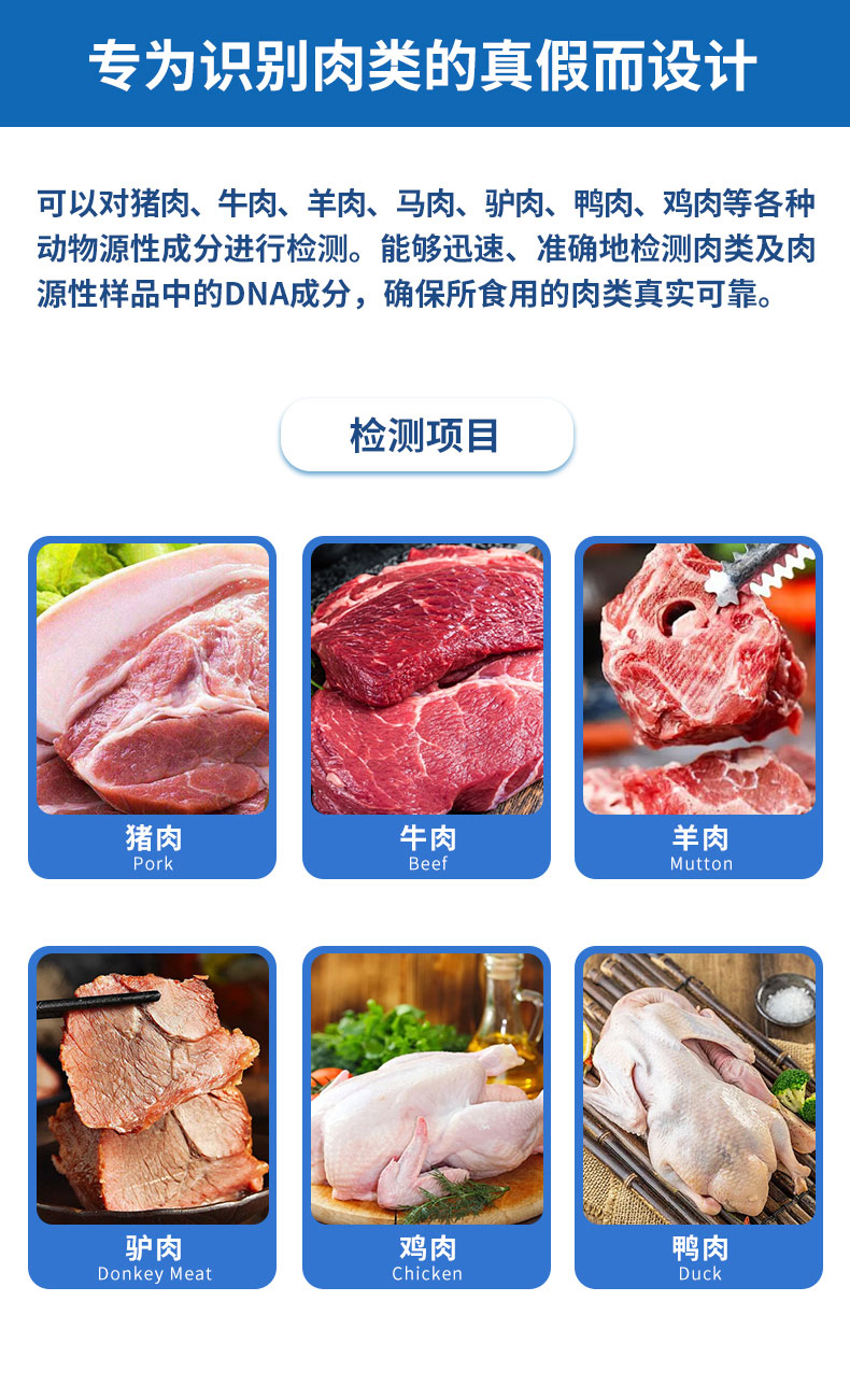 肉类鉴别仪是一款高效、便捷的食品检测设备,专为识别肉类的真假而设计。可以对猪肉、牛肉、羊肉、马肉、驴肉、鸭肉、鸡肉等各种动物源性成分进行检测。能够迅速、准确地检测肉类及肉源性样品中的DNA成分,确保所食用的肉类真实可靠。其高灵敏度和低误差率确保了检测结果的准确性,为各检测单位提供专业的检测服务。