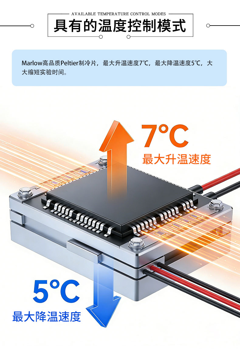7.Marlow高品质Peltier制冷片,结合德国高端PT1000温度传感器以及电性电阻加热补偿边缘的温度控制模式,最大升温速度7℃,最大降温速度5℃,大大缩短实验时间。