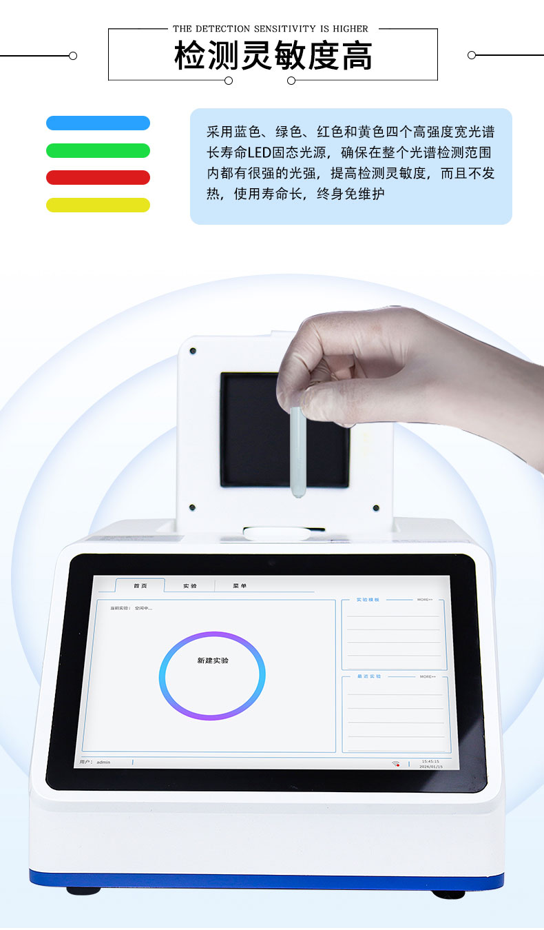5.采用蓝色、绿色、红色和黄色四个高强度宽光谱长寿命LED固态光源,确保在整个光谱检测范围内都有很强的光强,提高检测灵敏度,而且不发热,使用寿命长,终身免维护。