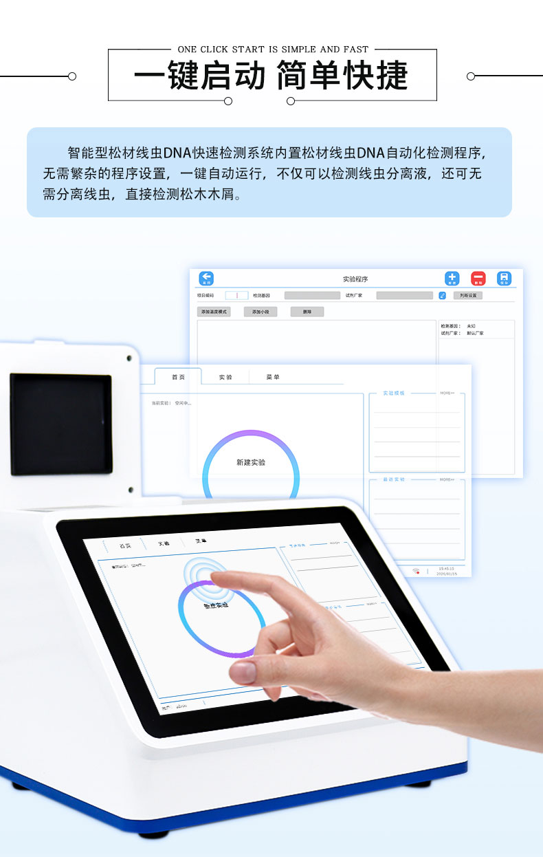 2.智能型松材线虫DNA快速检测系统内置松材线虫DNA自动化检测程序,无需繁杂的程序设置,一键自动运行,不仅可以检测线虫分离液,还可无需分离线虫,直接检测松木木屑。