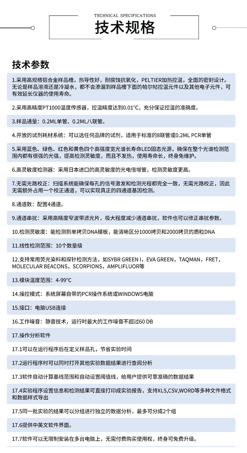 | 分析算法 | 扩增曲线,标准曲线定量、熔解曲线,基因分型(SNP),相对定量 |