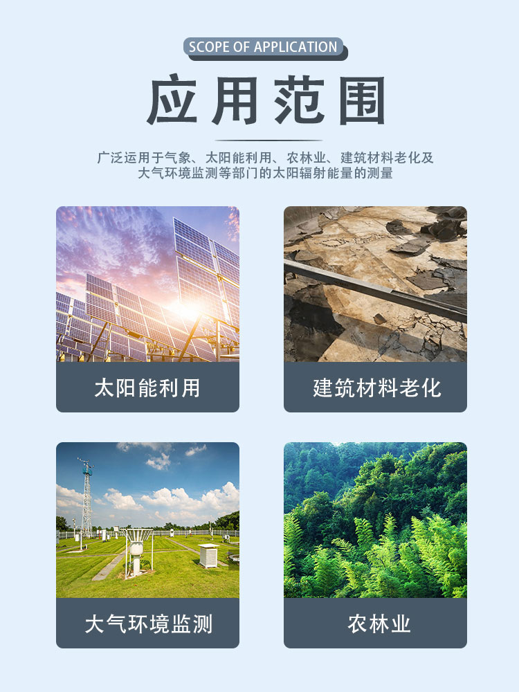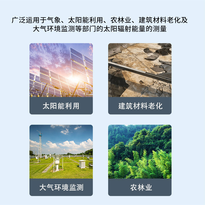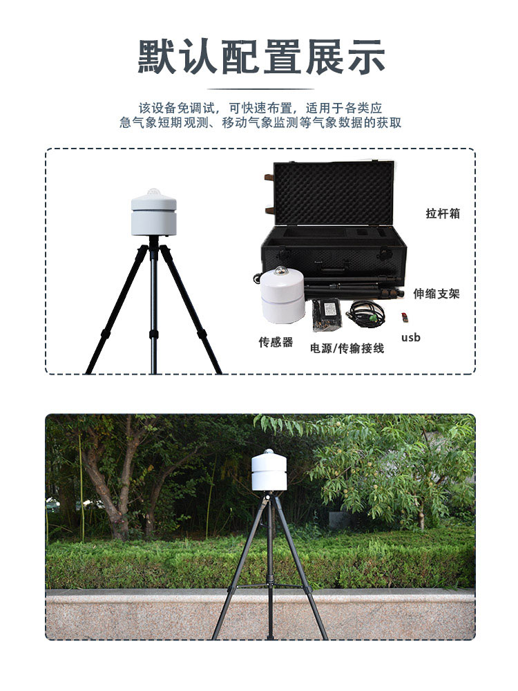 该设备免调试,可快速布置,适用于各类应急气象短期观测、移动气象监测等气象数据的获取。广泛运用于气象、太阳能利用、农林业、建筑材料老化及大气环境监测等部门的太阳辐射能量的测量。
