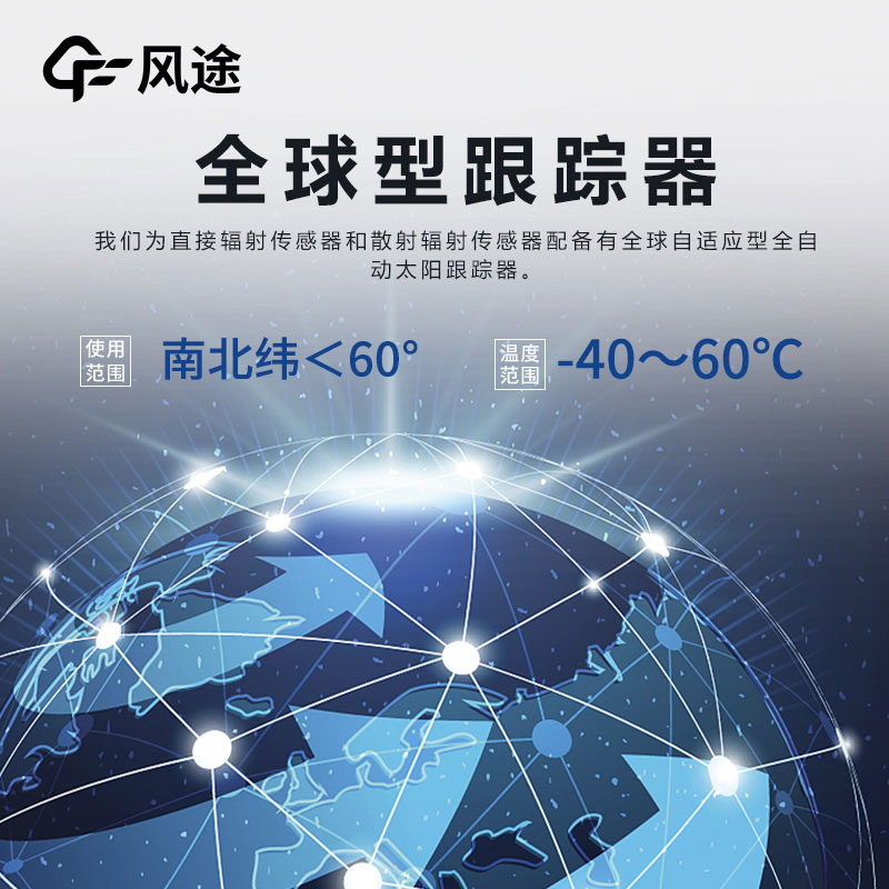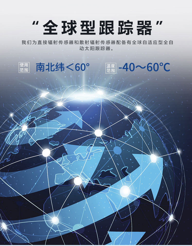 6、全球型跟踪器:我们为直接辐射传感器和散射辐射传感器配备有全球自适应型全自动太阳跟踪器。该款跟踪器可在南纬小于60°、北纬小于60°的全球范围内正常使用,使用温度范围在-40~60℃