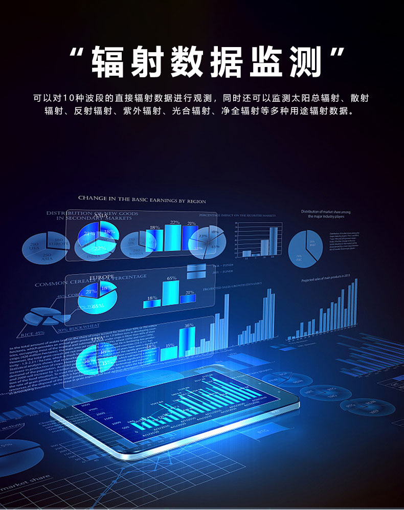 1、辐射数据监测:可以对10种波段的直接辐射数据进行观测,同时还可以监测太阳总辐射、散射辐射、反射辐射、紫外辐射、光合辐射、净全辐射等多种用途辐射数据。