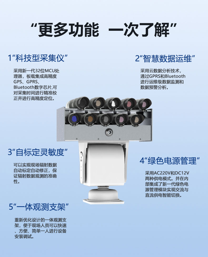 | 数据输出 | 280辐射瞬时值,340辐射瞬时值,380辐射瞬时值,440辐射瞬时值,500辐射瞬时值,670辐射瞬时值,870辐射瞬时值,940辐射瞬时值,1020辐射瞬时值,1640辐射瞬时值,280辐射累计值,340辐射累计值,380辐射累计值,440辐射累计值,500辐射累计值,670辐射累计值,870辐射累计值,940辐射累计值,1020辐射累计值,1640辐射累计值,太阳高度角,太阳方位角 |