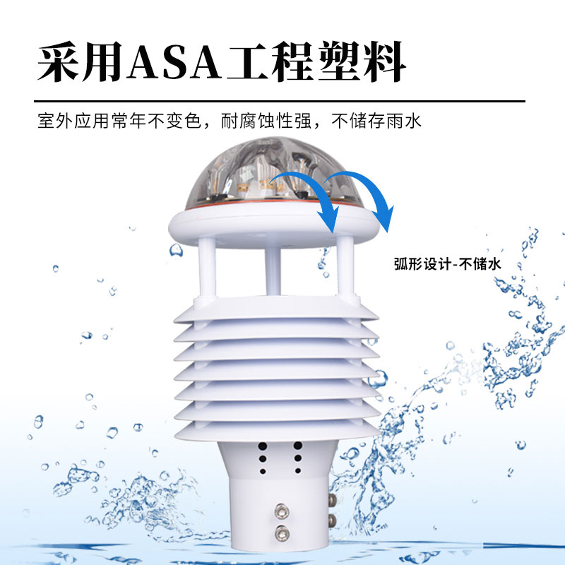 气象环境监测传感器创新性地将空气温度、空气湿度、大气压力、风速、风向、PM2.5、PM10、噪声、光学雨量、光照通过一个高集成度结构来实现,可实现户外气象参数24小时连续在线监测,通过数字量通讯接口将十项参数一次性输出给用户。