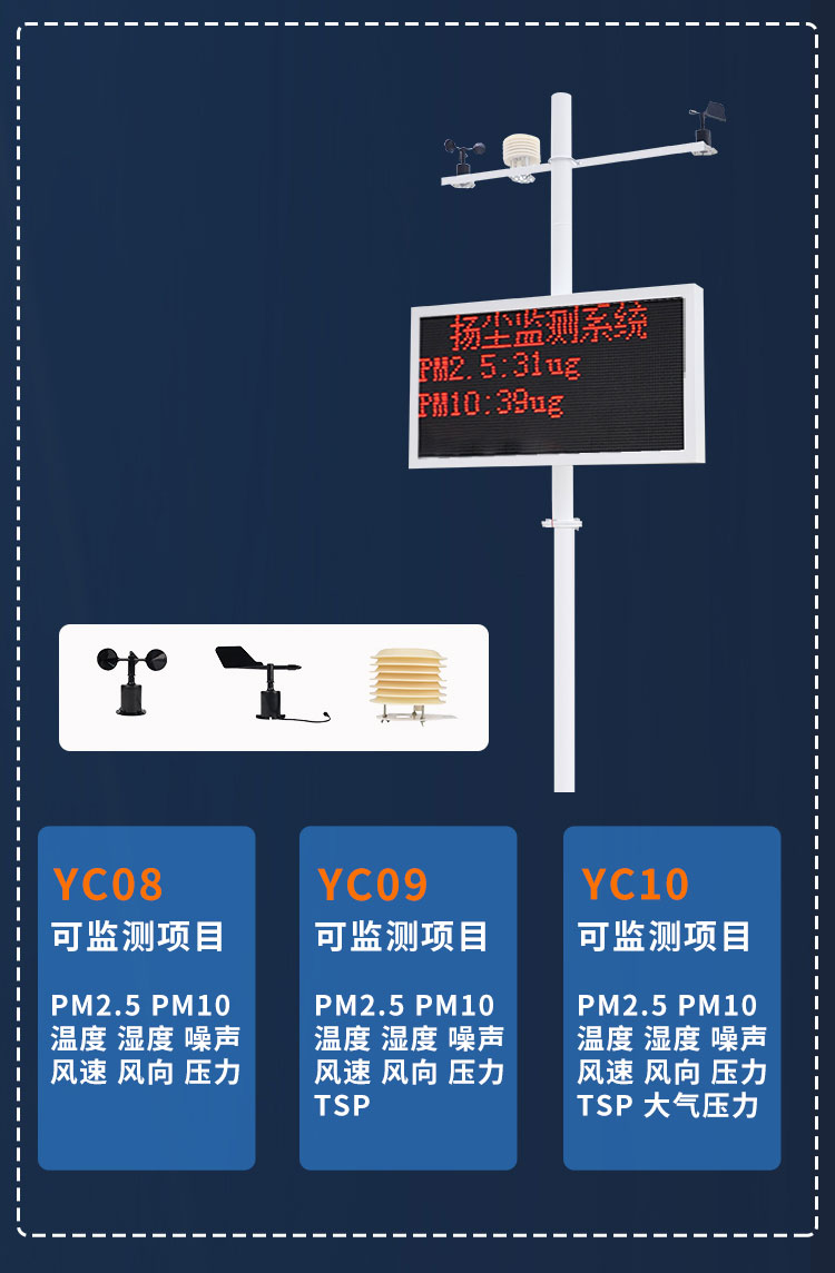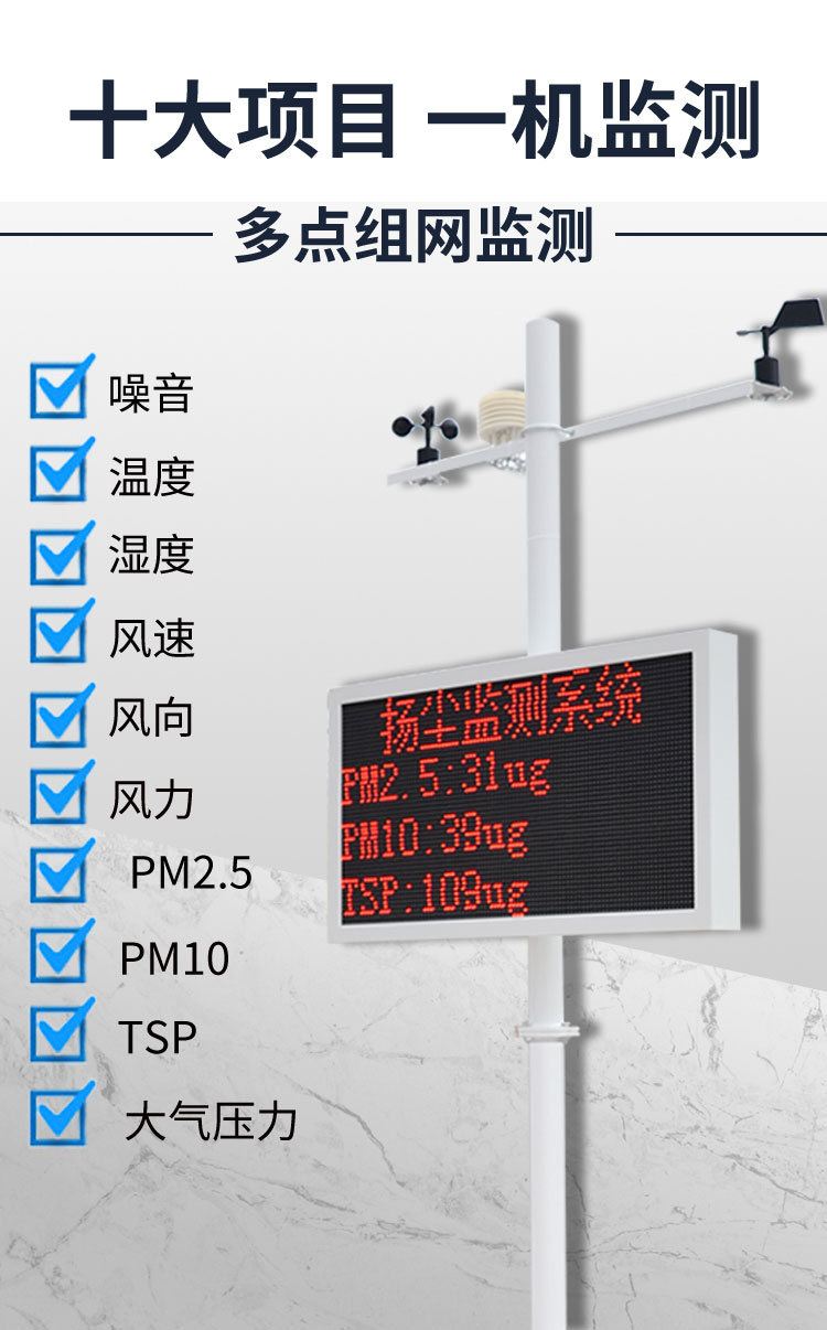 我公司为改善空气质量利用无线传感器技术和激光粉尘测试设备,自主研发的扬尘监控仪,除了可以实现扬尘监控以外,还可以监测PM2.5、PM10,PM1.0、TSP、噪声、环境温度,环境湿度,风速、风向等环境因子,各测试点的测试数据通过无线通讯直接上传到监测后台,大大节省了环保部门监测成本,提高监测效率。