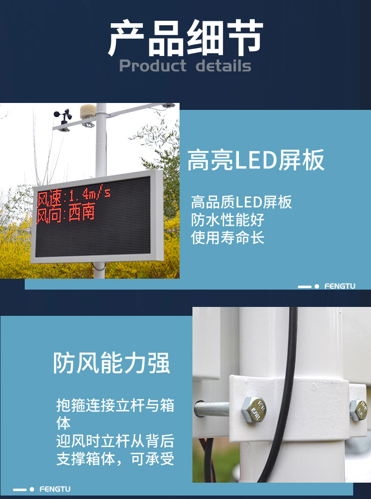 3、该设备具有 1 路百叶盒(温度、湿度、噪声、PM2.5、PM10、气压)采集、1 路风速采集、1 路风向采集。