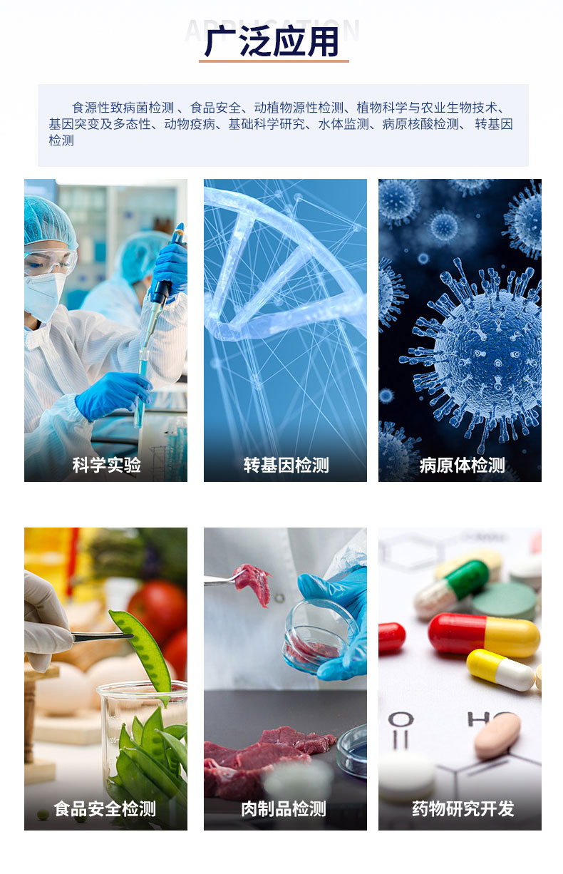 基础科学研究、病原体检测、肉制品掺假、转基因检测、食品安全检测、药物开发及合理用药、基因表达、水体监测、松材线虫检测、宠物检测、养殖业疫病检测