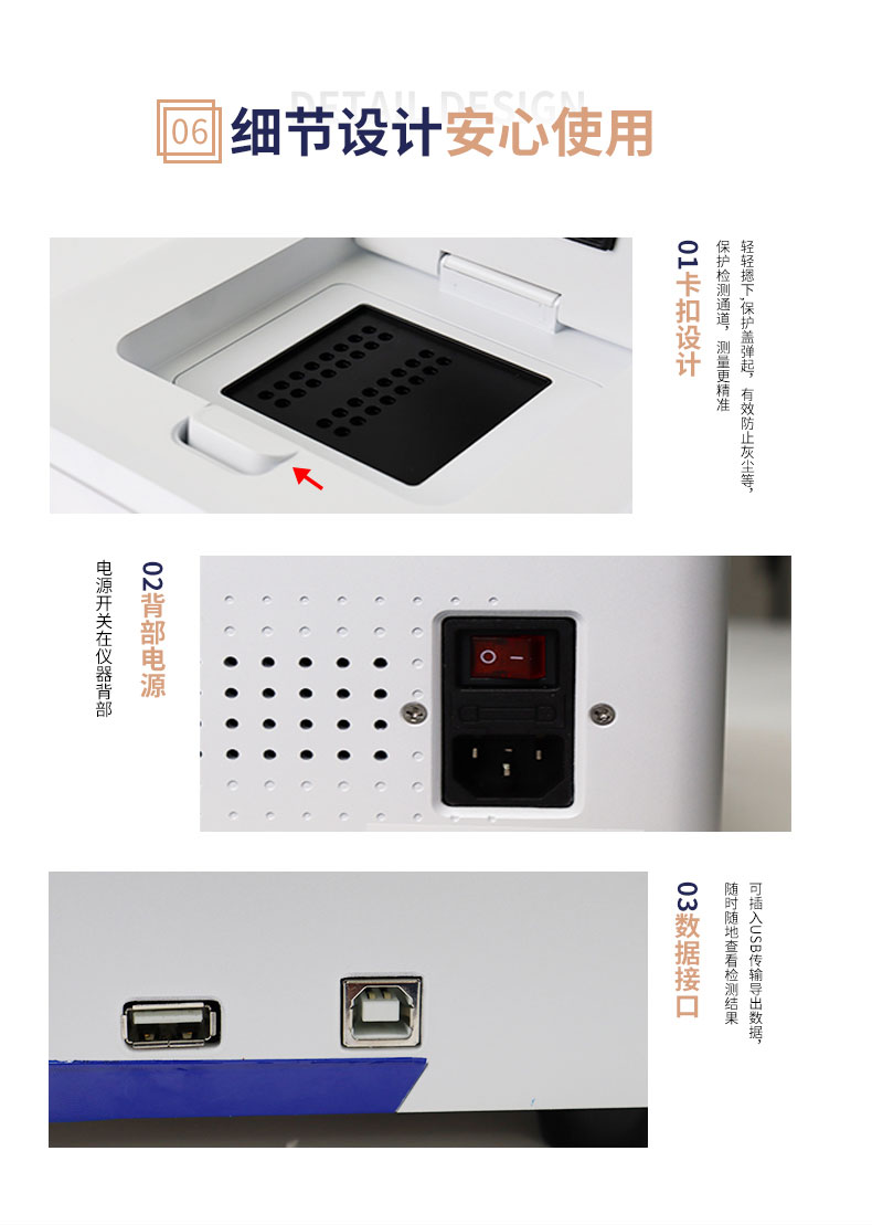 B免维护的灵敏光学系统:配备2个独立LED光源与2个独立光电二极管检测器,实现双通道荧光同步精准检测。采用超长寿命进口光源,设计寿命期内免维护,无需额外校准或更换,保障检测结果长期一致性与高灵敏度。