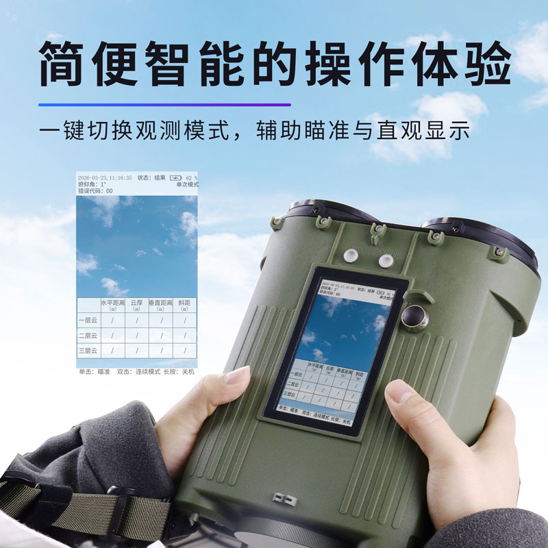 c)观测模式切换:提供灵活的观测模式。用户可选择单次测量模式快速获取当前数据,或选择连续自动观测模式,以长时间监测云高的动态变化过程;