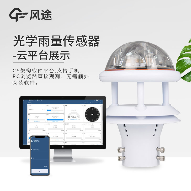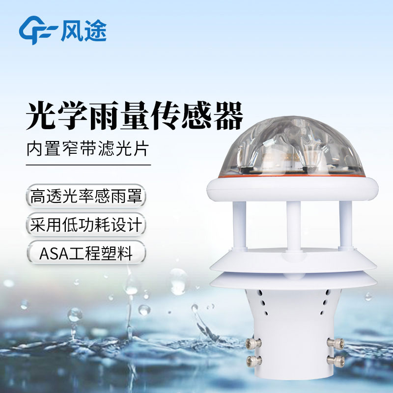光学雨量传感器采用纯正弦红外光源、内置窄带滤光片、感雨面达到78平方厘米,可高精度测量降雨量、不受高强度太阳光等光线影响。高透光率感雨罩不影响直射的太阳光,可兼容内置其他光学传感器,如光照、总辐射、紫外线传感器等。(发明专利,专利号ZL 2022 1 1306149.3)